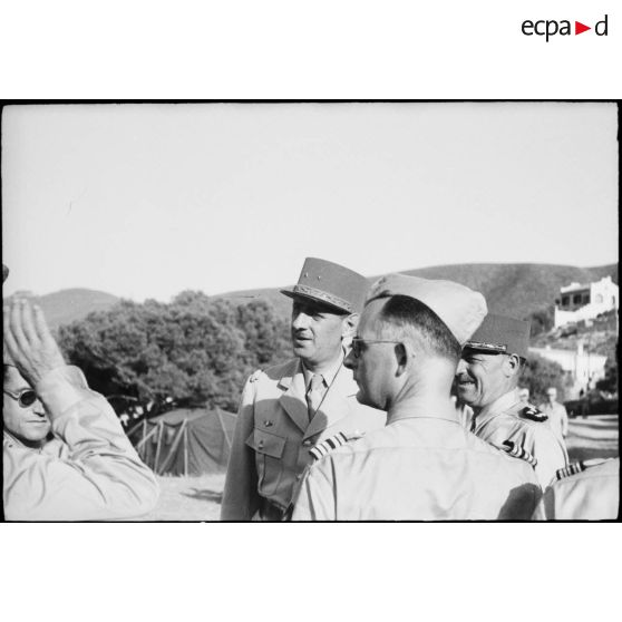 En visite auprès du CEF (corps expéditionnaire français) qui va être engagé en Italie, le général de Gaulle, coprésident du CFLN (Comité français de la Libération nationale) s'entretient avec les officiers.
