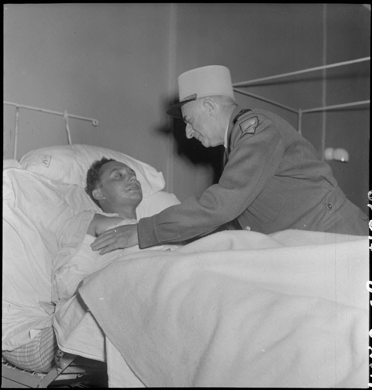 A l'hôpital de Lanessan, un légionnaire 2e classe du I/5e REI (régiment étranger d’infanterie) serre la main du général de Linarès venu remettre des décorations aux soldats blessés.