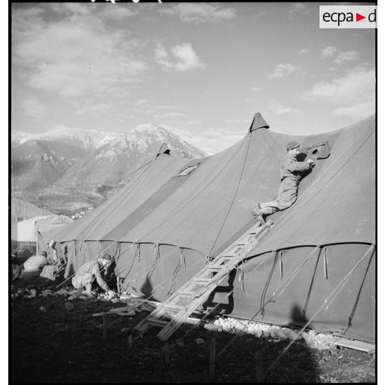 Installation de la cheminée sur une tente d'un hôpital de campagne sur le front italien.
