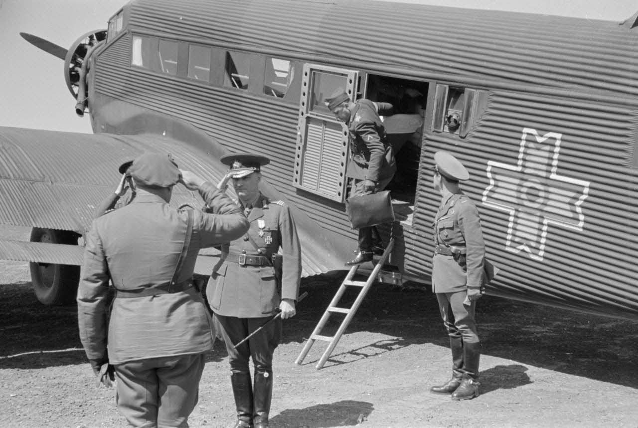 - Le général roumain Emanoil Ionescu, titulaire de la croix de chevalier de la croix de fer (10/05/1944), à la descente d'un avion de transport Junkers Ju-52. Sur le terrain d'aviation, le général (Generalleutnant) Hans von Greiffenberg (Ritterkreuz (18 Mai 1941).
