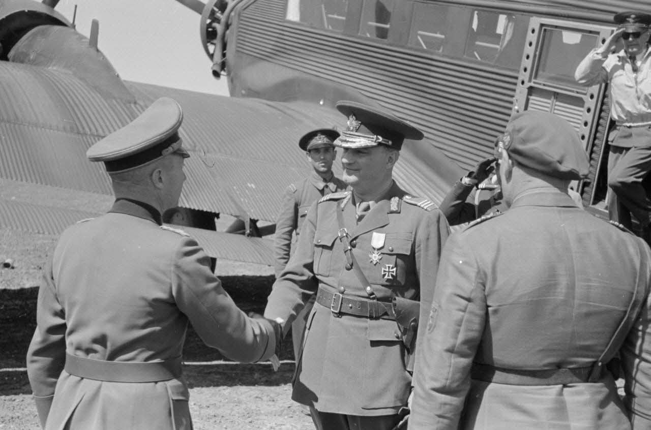 - Le général roumain Emanoil Ionescu, titulaire de la croix de chevalier de la croix de fer (10/05/1944), à la descente d'un avion de transport Junkers Ju-52. Sur le terrain d'aviation, le général (Generalleutnant) Hans von Greiffenberg (Ritterkreuz (18 Mai 1941).