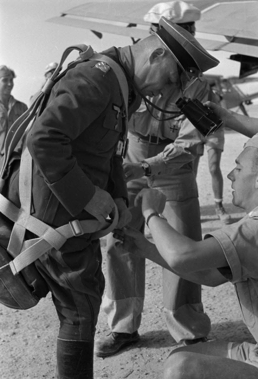 Pendant la campagne d'Afrique, en Egypte, le maréchal Erwin Rommel s'équipe d'un parachute- Document non daté - images Presse-Illustrationen Heinrich Hoffmann / Kriegsberichter Krempl, publiée dans le "Berliner Illustrirte Zeitung" 45/1942 Originalaufnahme im Archiv von Ullstein bild.
