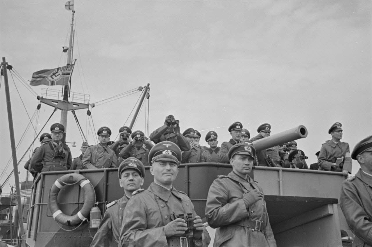 Le général Friedrich Dollmann et l'état-major de la 7e armée allemande (AOK 7) sur le pont d'un navire lors de manoeuvres d'exercice (opération Seelöwe).