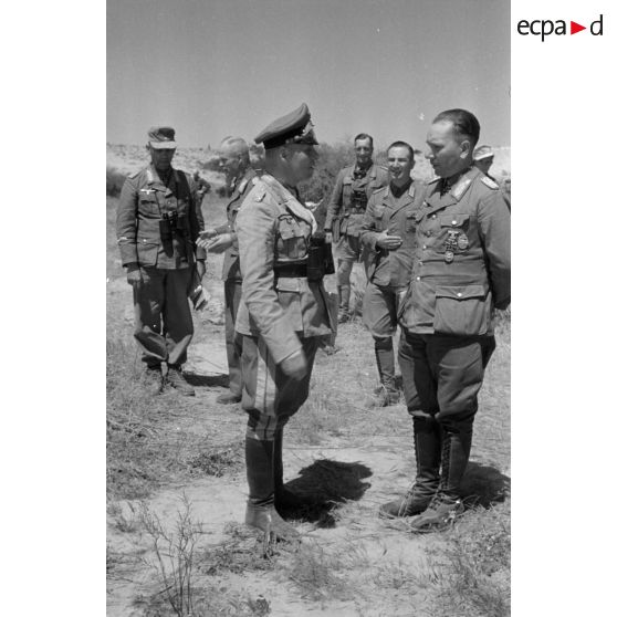 Le maréchal (Generalfeldmarschall) Erwin Rommel en conversation avec Nehring, entourés d'autres officiers dont le général (Generalmajor) von Bismarck.