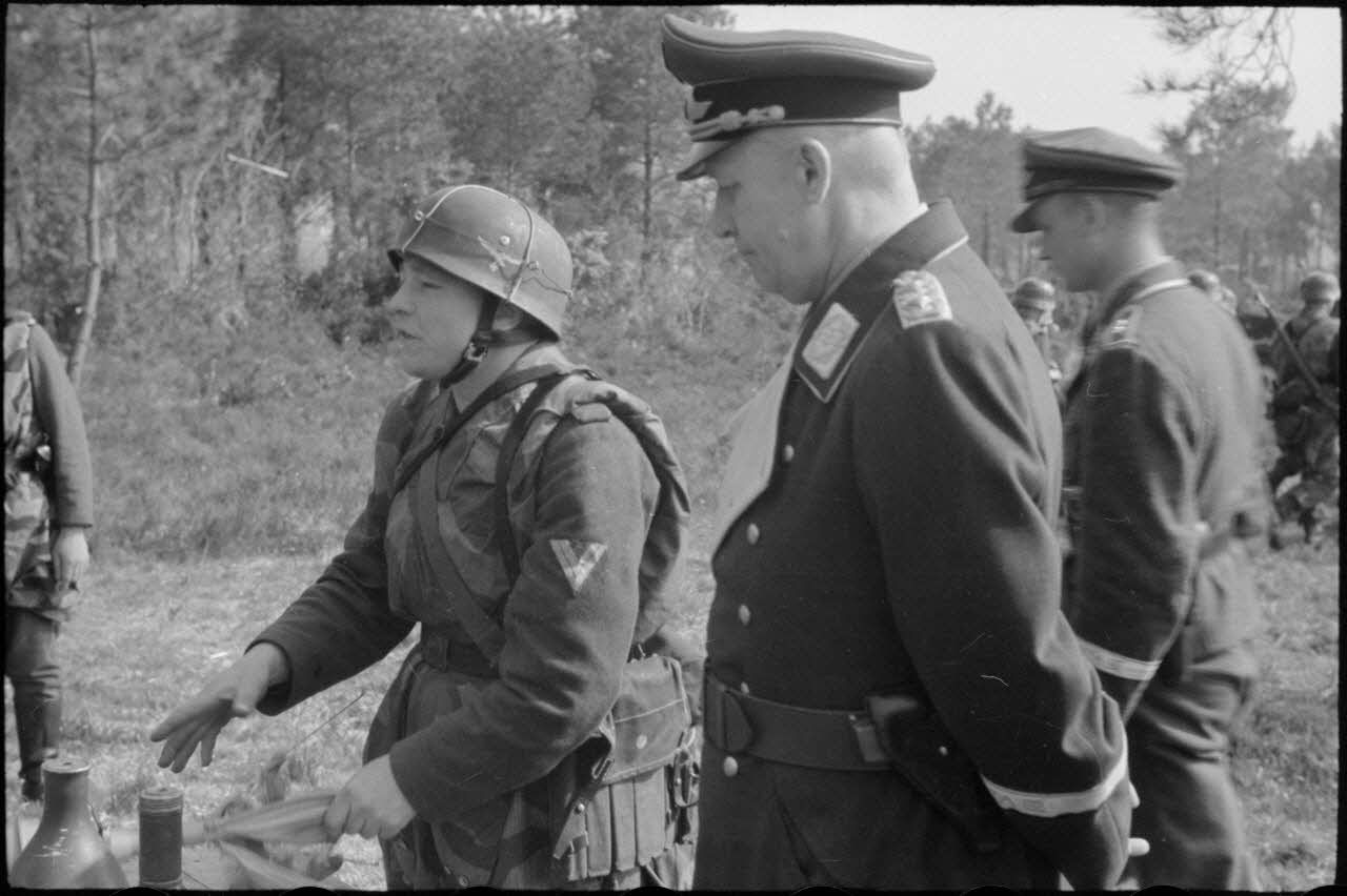 Le général (General der Fallschirmtruppe) Eugen Meindl du II.Fallschirm-Korps et le commandant (Major) Karl-Heinz Becker du Fallschirmjäger.Regiment 1 assistent également à cette démonstration.