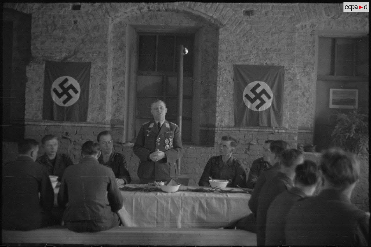 Le général (Generalleutnant) Robert Pistorius partage un repas avec des hommes 4e division d'infanterie de l'armée de l'air allemande après avoir prononcé un discours.