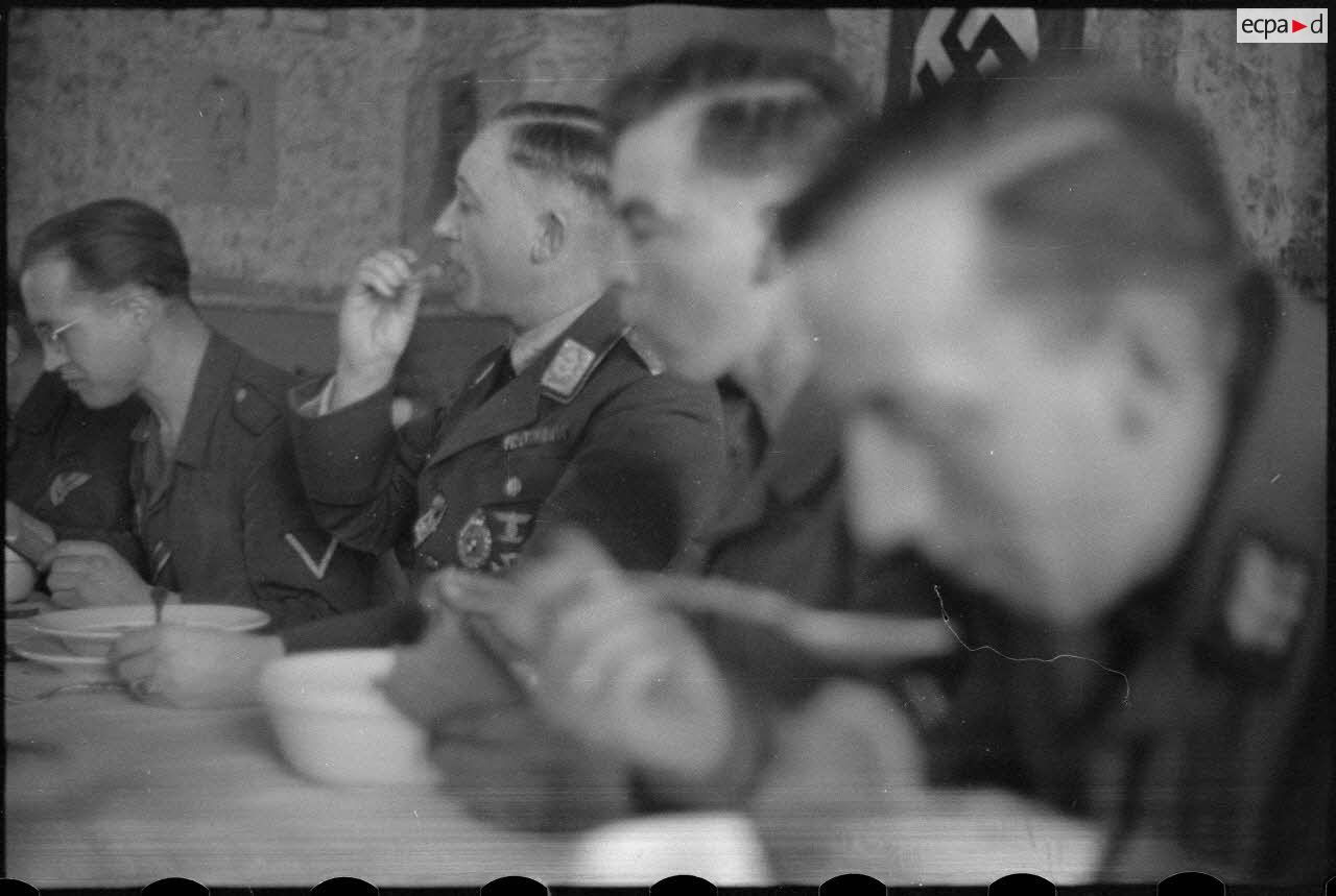 Le général (Generalleutnant) Robert Pistorius partage un repas avec des hommes 4e division d'infanterie de l'armée de l'air allemande après avoir prononcé un discours.
