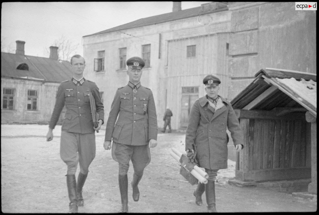 Le maréchal (Generalfeldmarschall) Busch en compagnie de deux officiers supérieurs, à gauche, il pourrait s'agir du général (Generaloberst) Georg-Hans Reinhardt.