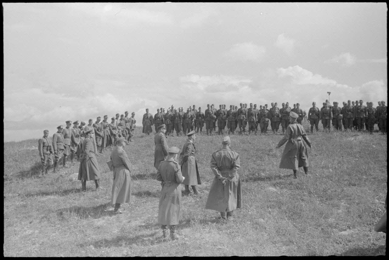 Note : le Major Hans Müller évolue au sein du Infanterie-Regiment 111, 35. Infanterie-Division. La date du reportage ne peut correspondre à la date de remise de la croix de chevalier de la croix de fer (Ritterkreuz) le 18 février 1943. Les images Pk.697 film 771 L16aet L17a présentent des meules de foin réalisées à la fin des moissons. Le lieutenant Edwin Stolz est mort au combat le 17/05/1944.