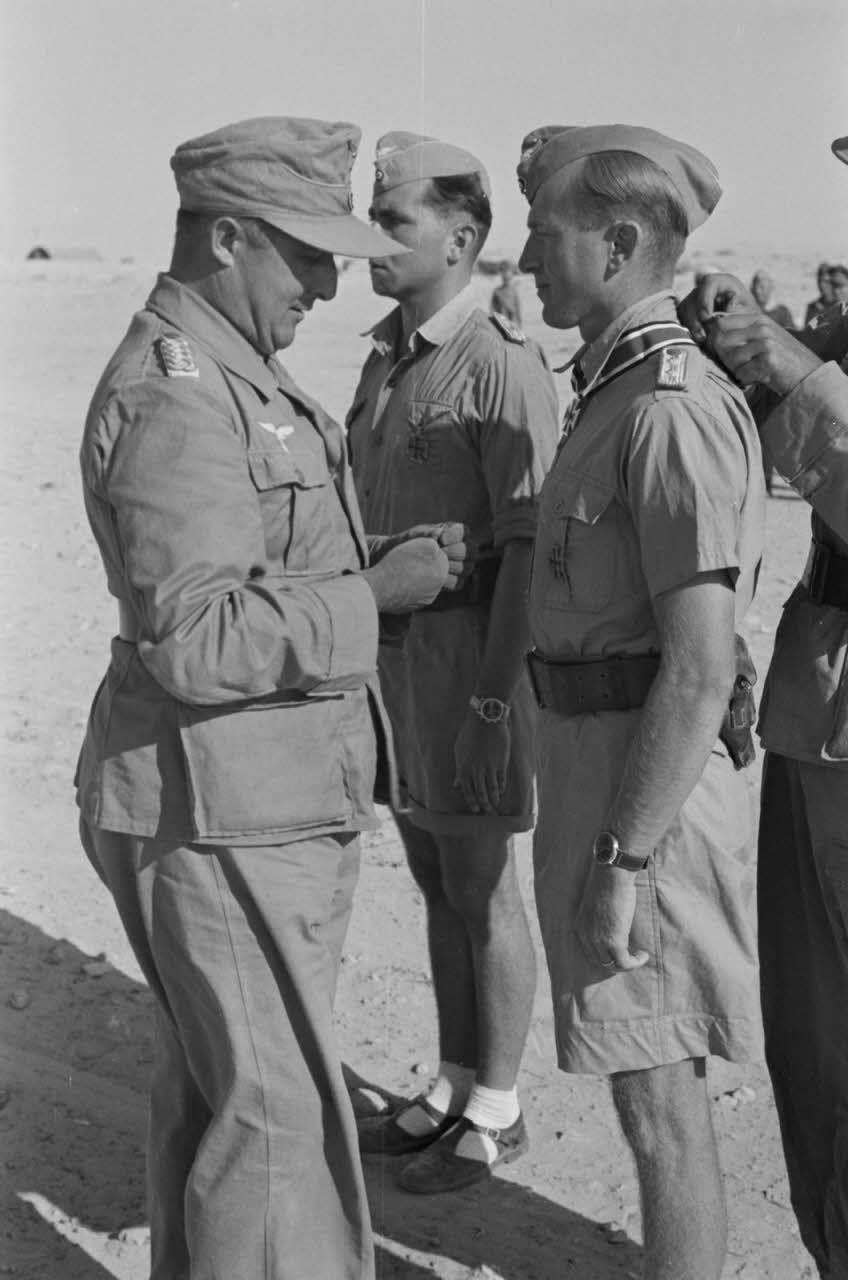 L'arrivée du général Seidemann à bord d'un Storch codé GB+XK (DAA 2503 L01 à L04). Le capitaine (Hauptmann) Bernhard Hamester (Ritterkreuz le 03/09/42) alors Staffelkapitän au III.Sturzkampfgeschwader StG-3. Remise de la Ritterkreuz au capitaine Martin Mossdorf. Le colonel (Obersleutnant) Walter Sigel, commandant de l'escadrille (Geschwaderkommodore) est salué par le général Seidemann.