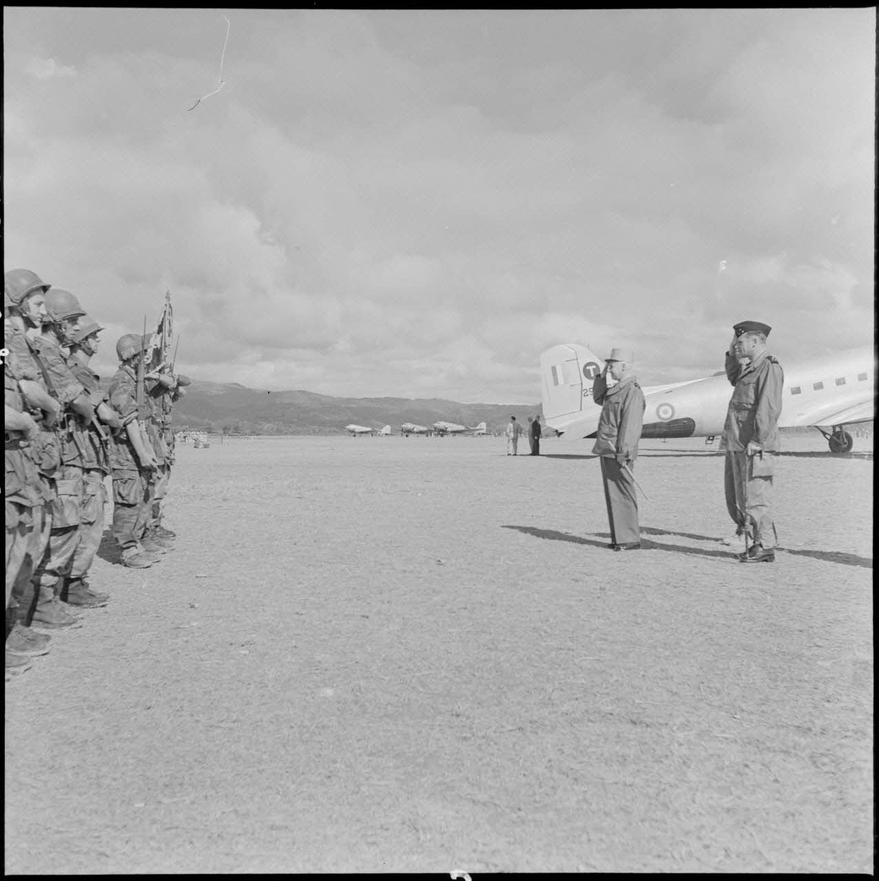 Le général Navarre accompagné du général Cogny salue le drapeau du bataillon de parachutistes à Diên Biên Phu.
