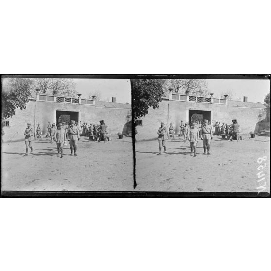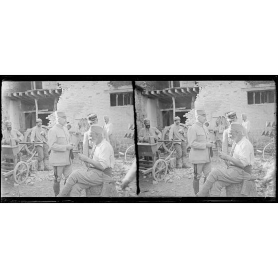 Villers-Allerand (Marne). Le général Pétain dans un cantonnement à l'heure de la soupe.