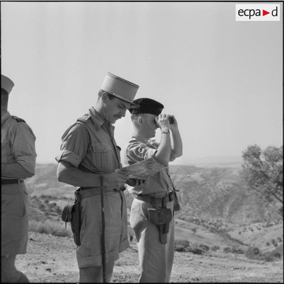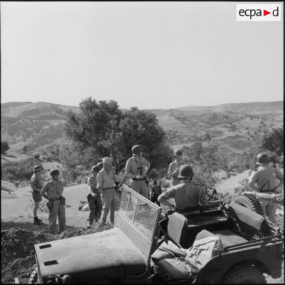 Le général Simon (2e à gauche), commandant la 20e DI (division d'infanterie) et le commandant Lambert (2e à droite), chef du secteur regardent une carte pour le repérer l'emplacement de la future piste.
