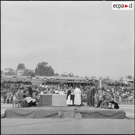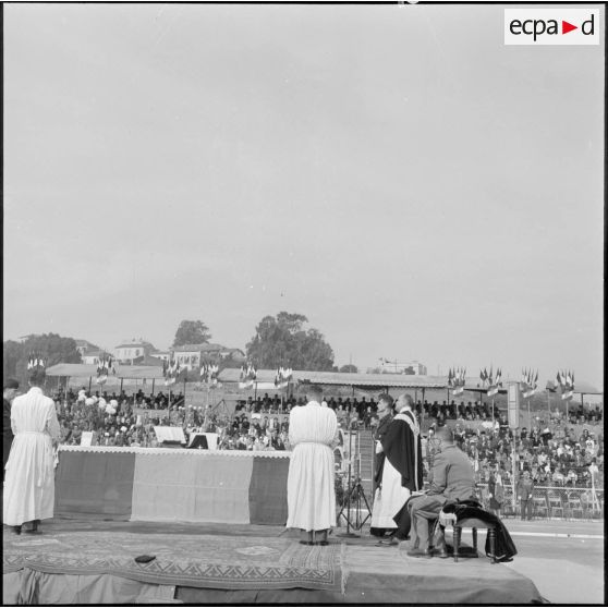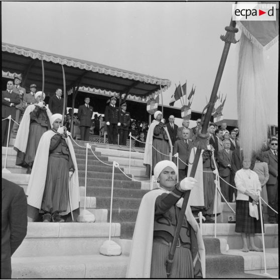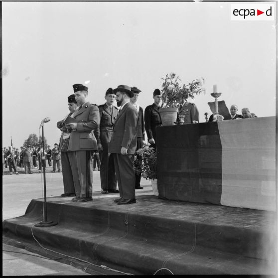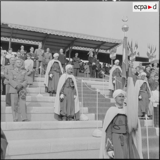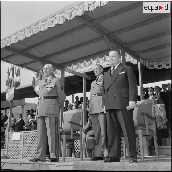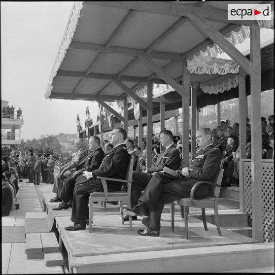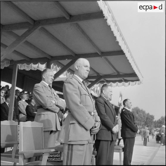 La tribune au cours de la cérémonie le général Edmond Jouhaud, commandant la 5ème région aérienne et adjoint au général Raoul Salan, Serge Baret inspecteur général de l’administration en mission extraordinaire (IGAME) et préfet d'Alger.