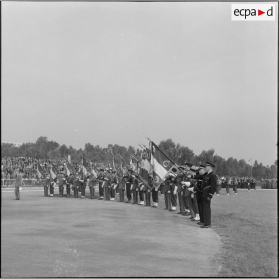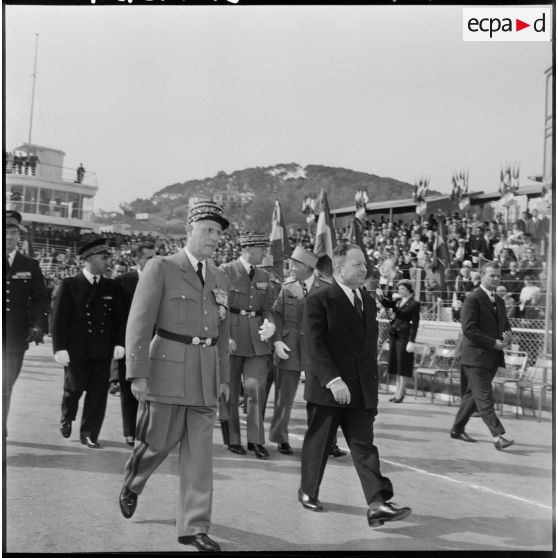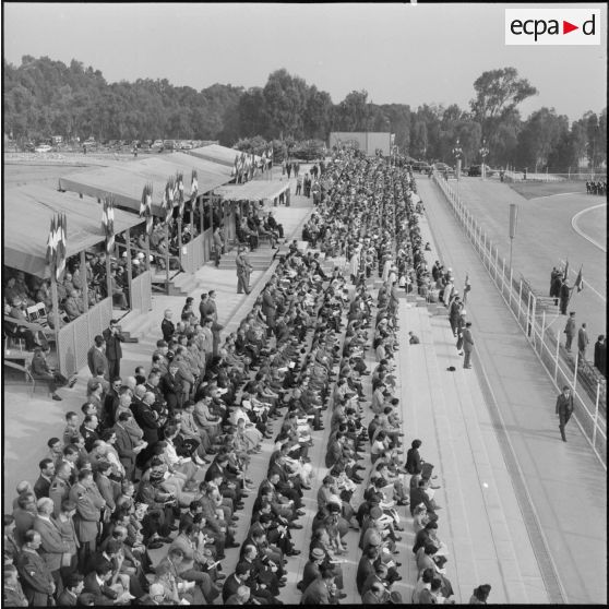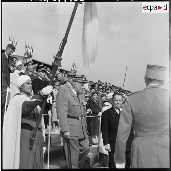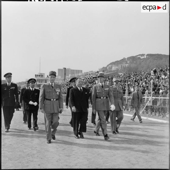 A l'issue de la cérémonie Robert Lacoste, ministre de l'Algérie, et le général Salan, commandant supérieur interarmées et commandant la 10ème région militaire, quittent le stade Tagarin sous les acclamations de la foule.
