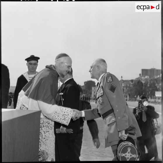 Le général Raoul Salan,commandant supérieur interarmées et commandant la 10ème région militaire, salue monseigneur Duval archevêque d'Alger.