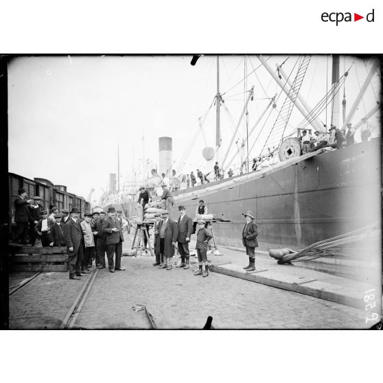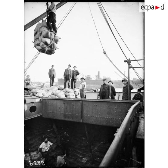 Le Havre. Déchargement d'un navire de sucre. Les sacs de sucre sortent des cales. [légende d'origine]