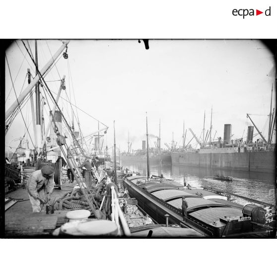 Déchargement d'une cargaison de sucre et transbordement sur des péniches dans le port du Havre (Seine-Inférieure).