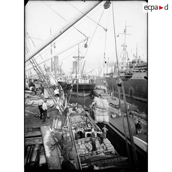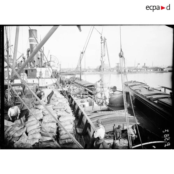 Le Havre. Déchargement d'un navire de sucre. Des sacs de sucre sur une péniche.