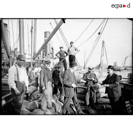 Le Havre. Déchargement d'un navire de sucre. On vérifie la qualité du sucre.