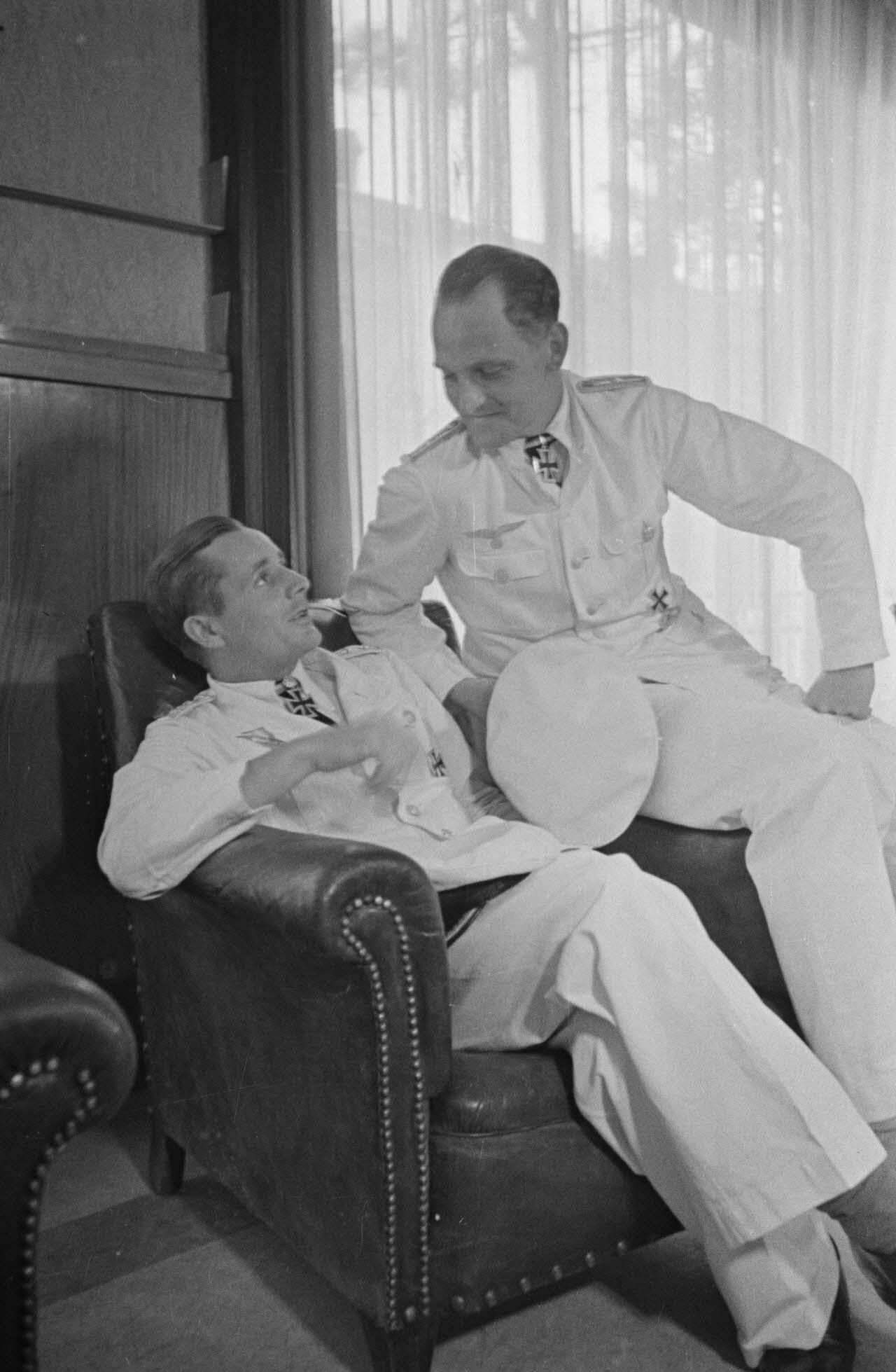 Le Kapitänleutnant Engelbert Endrass, commandant du sous-marin U-46, en compagnie de l'Oberleutnant zur See Erich Topp (U-552) lors de la visite d'une exposition à La Baule.