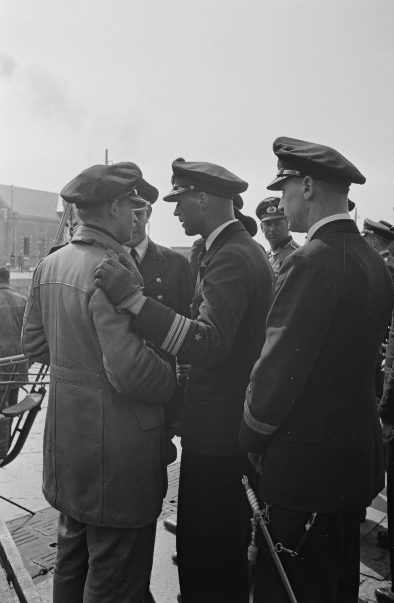 Le Kapitänleutnant Karl Thurmann commandant du sous-marin U-553 débarque sur le quai du port de Saint-Nazaire où des officiers de la Kriegsmarine l'accueillent.