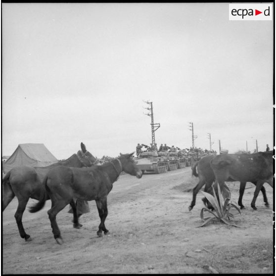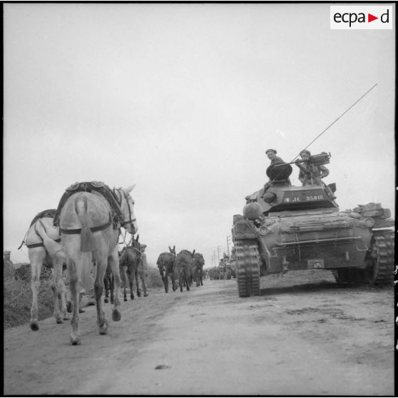 Colonne de chars M24 Chaffee du 1er RCh et colonne de mulets.
