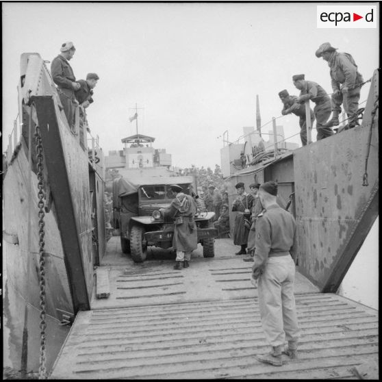 Débarquement d'un Dodge T214 WC52 d'un LCT (Landing Craft Tank).
