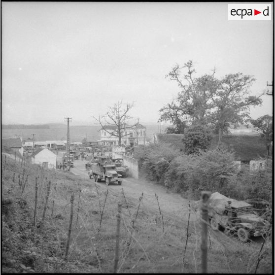 Des véhicules et des blindés du groupement "Sizaire" circulant dans une rue de Sept Pagodes.