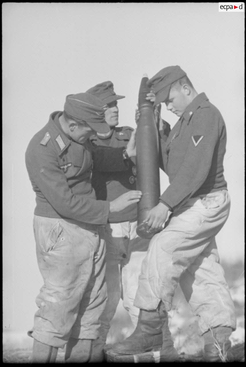 Le lieutenant Albert Ernst et son équipage devant le canon automoteur Nashorn du Schwere Panzerjäger-Abteilung 519.