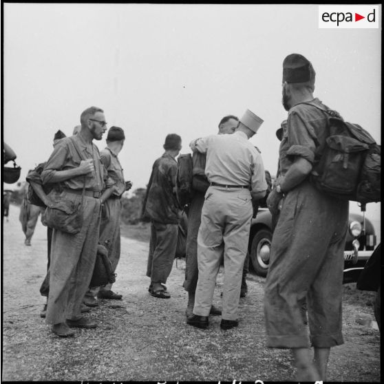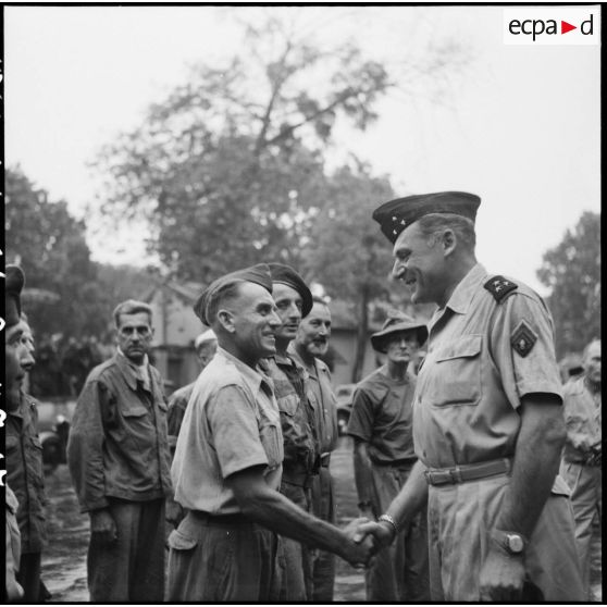 Le colonel de Winter accueillant des officiers libérés par le Vietminh à leur arrivée au bac des Quatre colonnes.