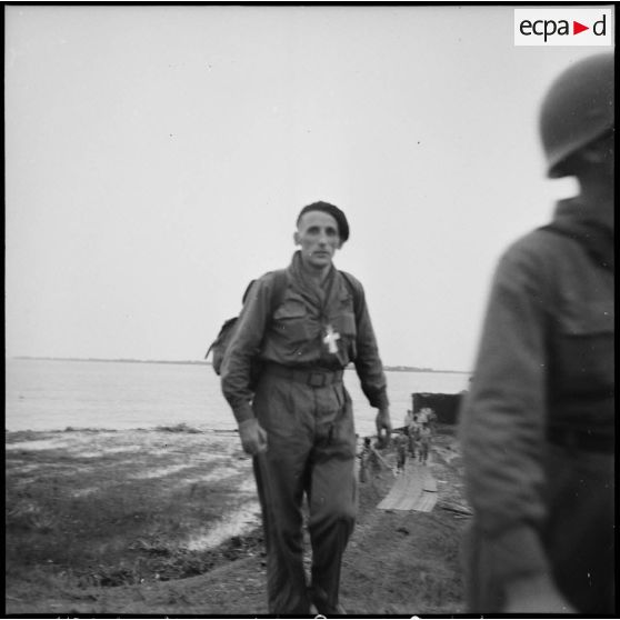 L'aumônier Heinrich parmi le groupe d'officiers libérés par le Vietminh débarquant au bac des Quatre colonnes près d'Hanoï.