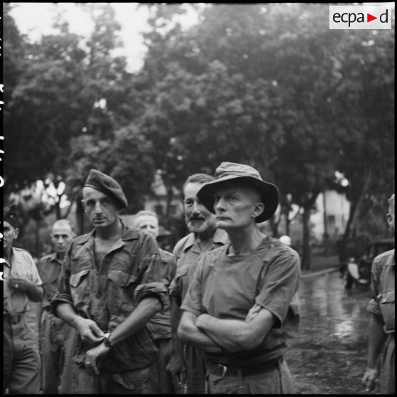 Un groupe d'officiers libérés par le Vietminh attend son transfert vers l'hôpital Lanessan à Hanoï.