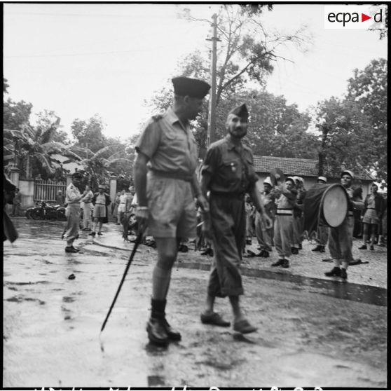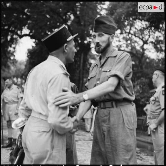 Le lieutenant-colonel Lemeunier, libéré d'un camp de prisonniers Vietminh, donne une poignée de main à son chef de musique qu'il retrouve devant l'hôpital Lanessant à Hanoï.