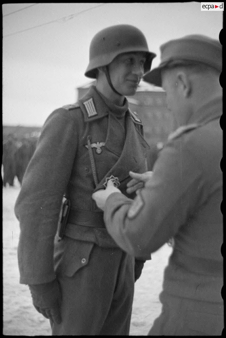 Le commandant (Major) Horst-Wolf Hoppe remet une décoration à un caporal, au centre le lieutenant de réserve Julius Stehler.