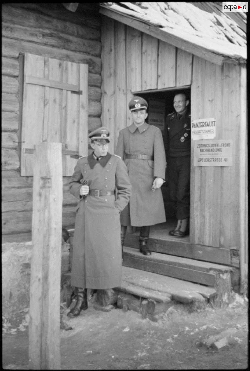 Le lieutenant Fischer commandant la 697e compagnie de propagande (Panzer Propagandakompanie 697) saluant des officiers d'état-major lors de leur départ.