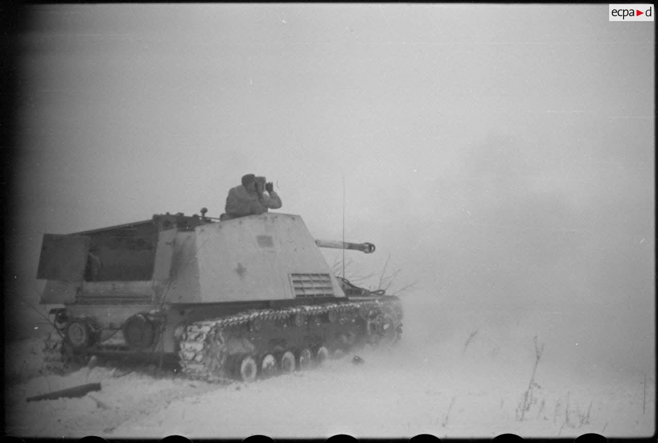 Le lieutenant (Leutnant) Albert Ernst commande le tir à bord du Nashorn " Büffel " du 1er escadron du 519e (1./s.Pz.Jäg.Abt-519).