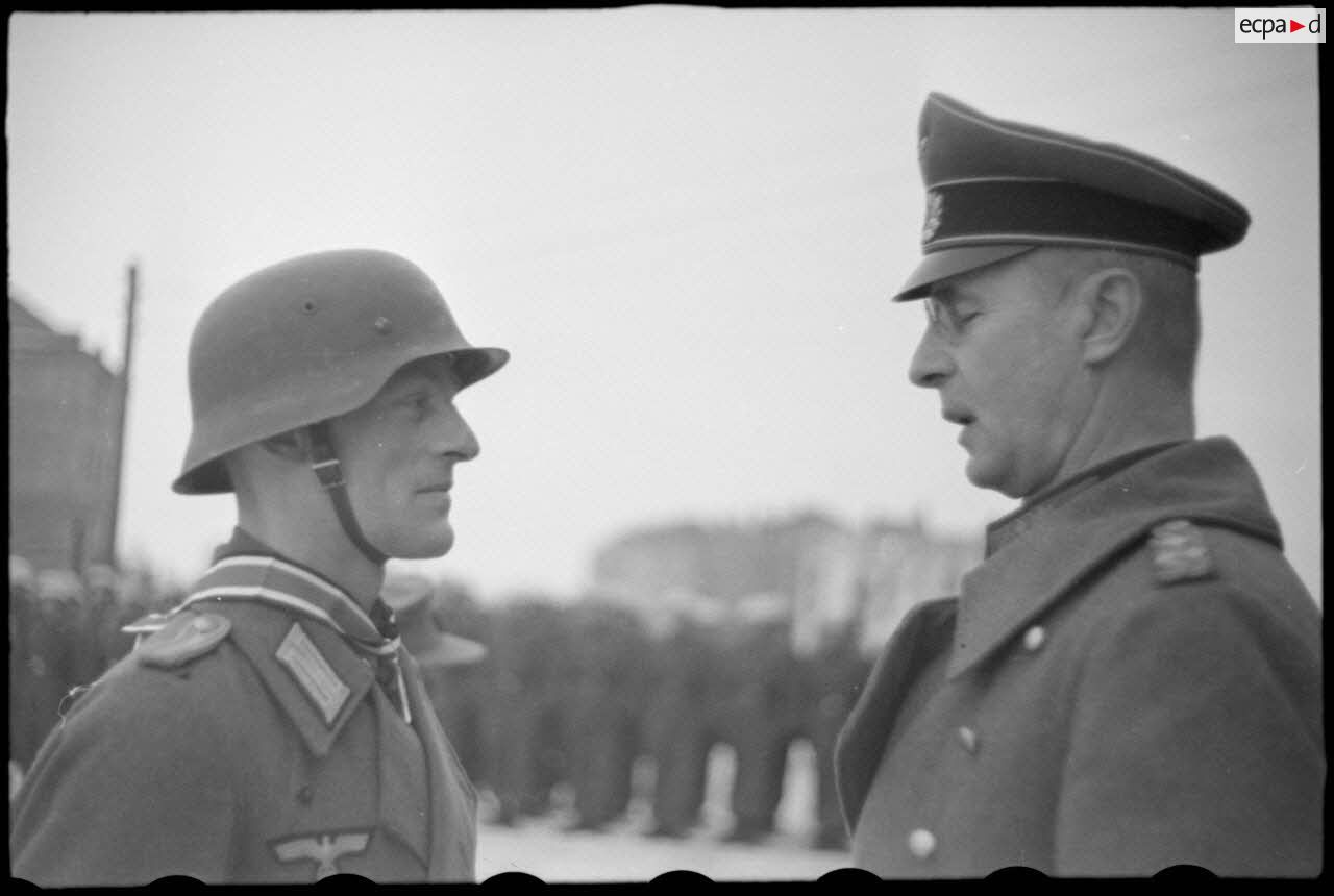 Le commandant (Major) Horst-Wolf Hoppe remet une décoration à un caporal, au centre le lieutenant de réserve Julius Stehler.