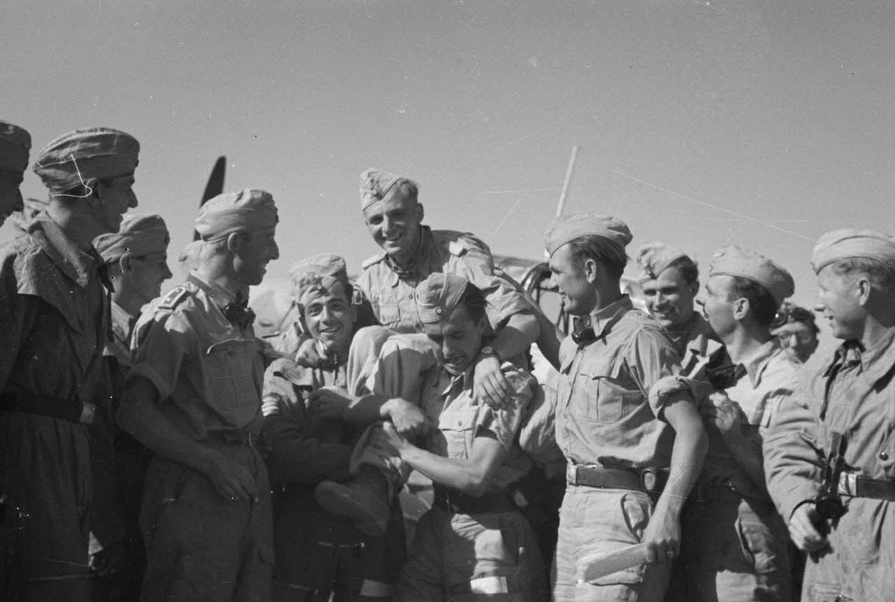 Les camarades de son unité, avec qui il a partagé presque toutes ses missions aériennes, l'accueillent à son retour de mission.
