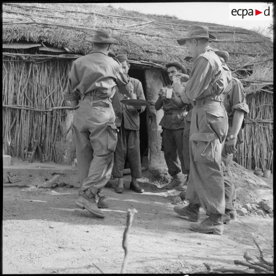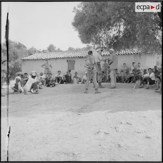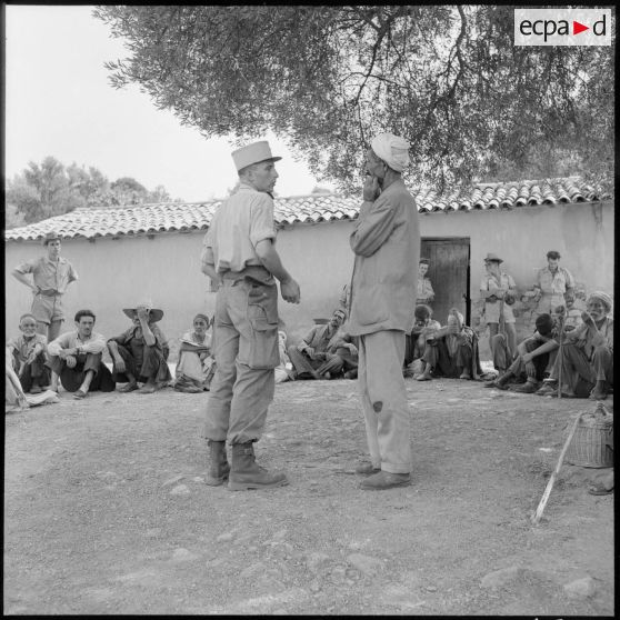 Le lieutenant SAS Burthey et le capitaine Dupuy de la 1re compagnie du 93e régiment d'infanterie (RI) en conversation avec un habitant du village de Kemouda
