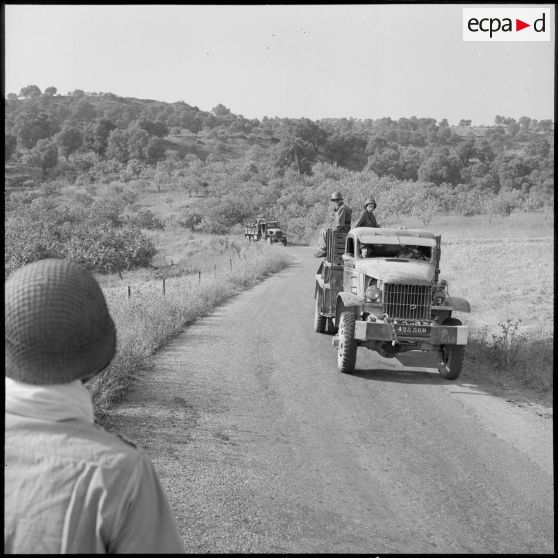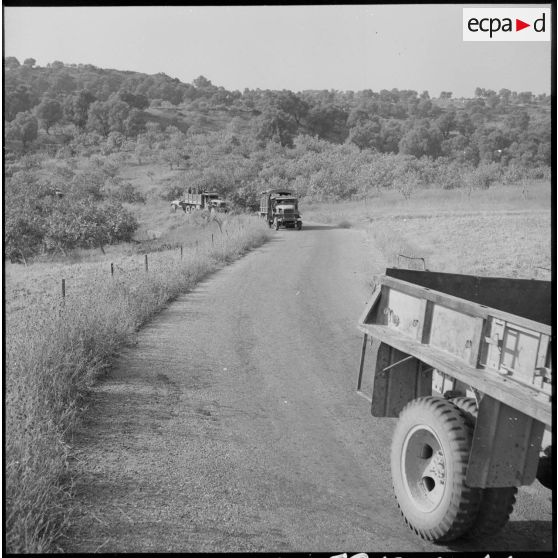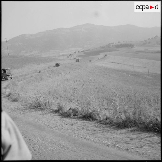 Le convoi de véhicules militaires de la 1re compagnie du 93e régiment d'infanterie (RI) progressant dans la plaine aux environs de Tizi Ouzou.