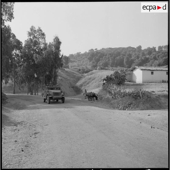Un véhicule Scout car M3A1de la 1re compagnie du 93e régiment d'infanterie (RI) se dirigeant vers Tizi Ouzou pour le ravitaillement.