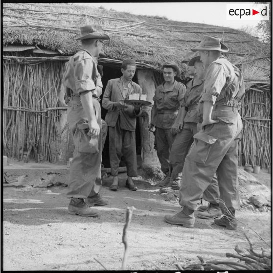 Un serveur proposant des verres de citronade aux soldats de la 1re compagnie du 93e régiment d'infanterie (RI).