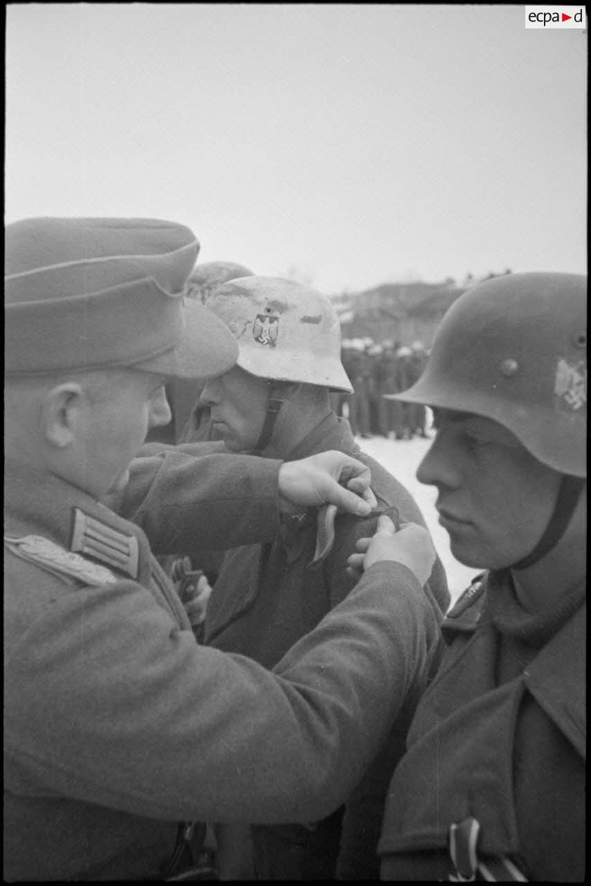 Le Major Hoppe remet des épaulettes à un sous-officier du schwere Panzerjäger-Abteilung 519.