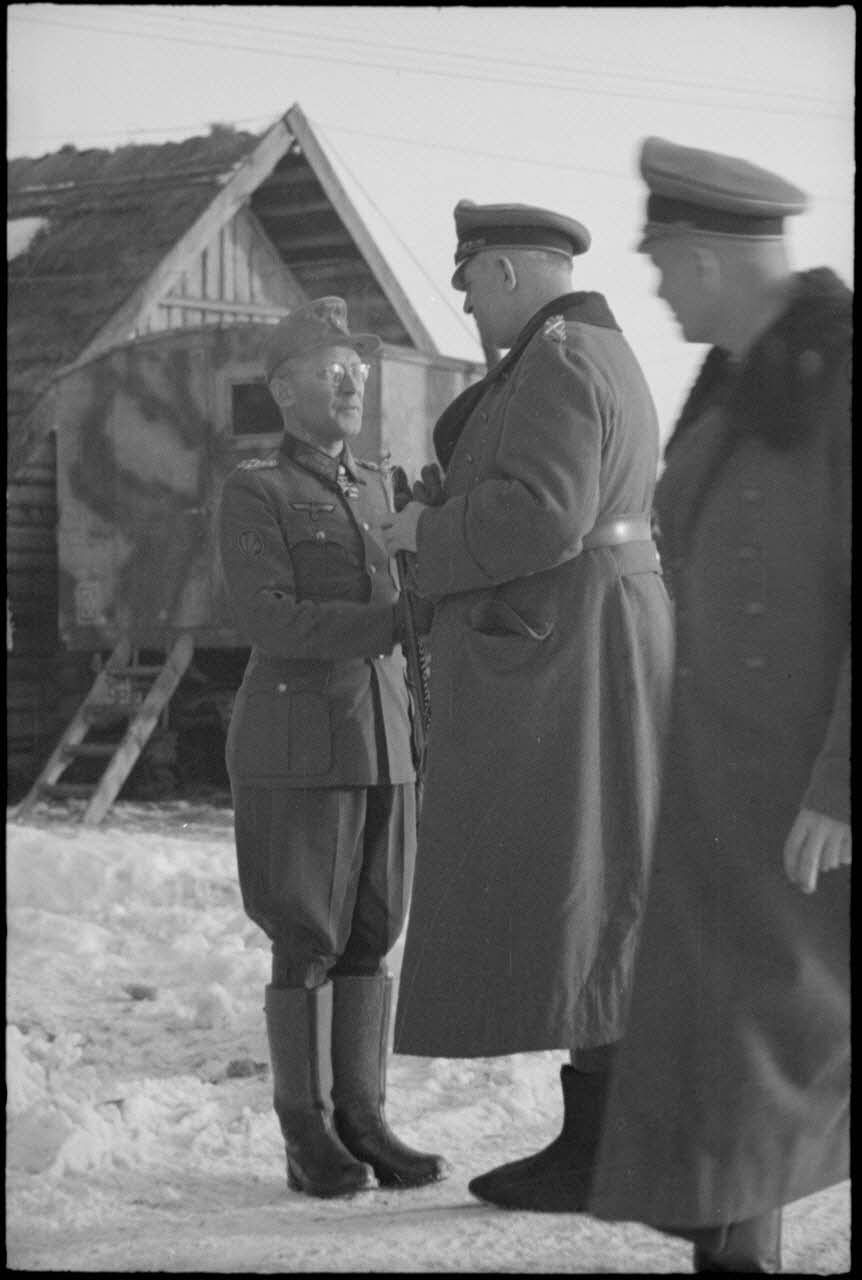 Le maréchal (Generalfeldmarchall) Buch en présence du général (Generalleutnant) Helmut Thumm (commandant de la 5. Jäger. Division).