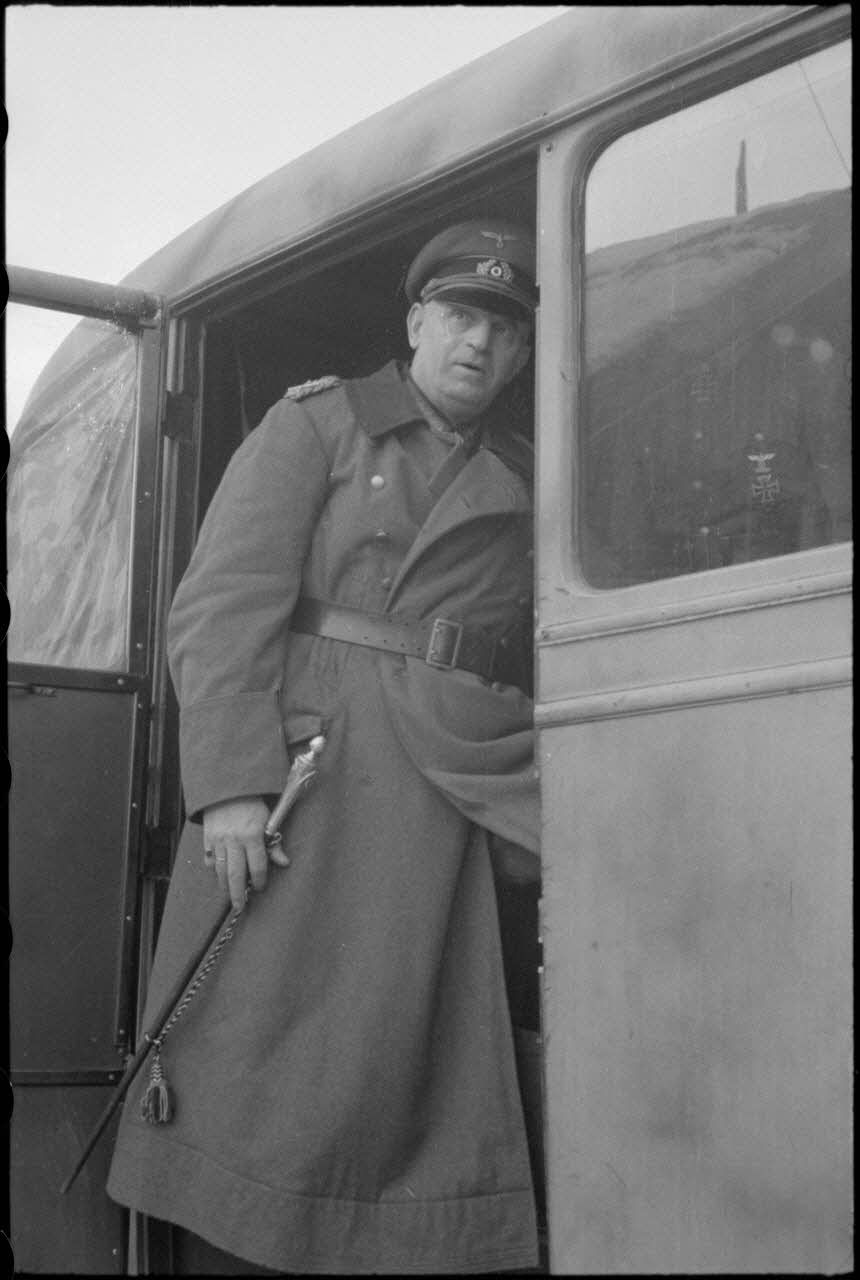 Le maréchal (Generalfeldmarchall) Ernst Buch quitte un bus dans lequel vient de se tenir une réunion d'état-major.