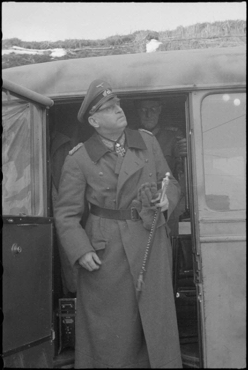 Le maréchal (Generalfeldmarchall) Ernst Buch quitte un bus dans lequel vient de se tenir une réunion d'état-major.
