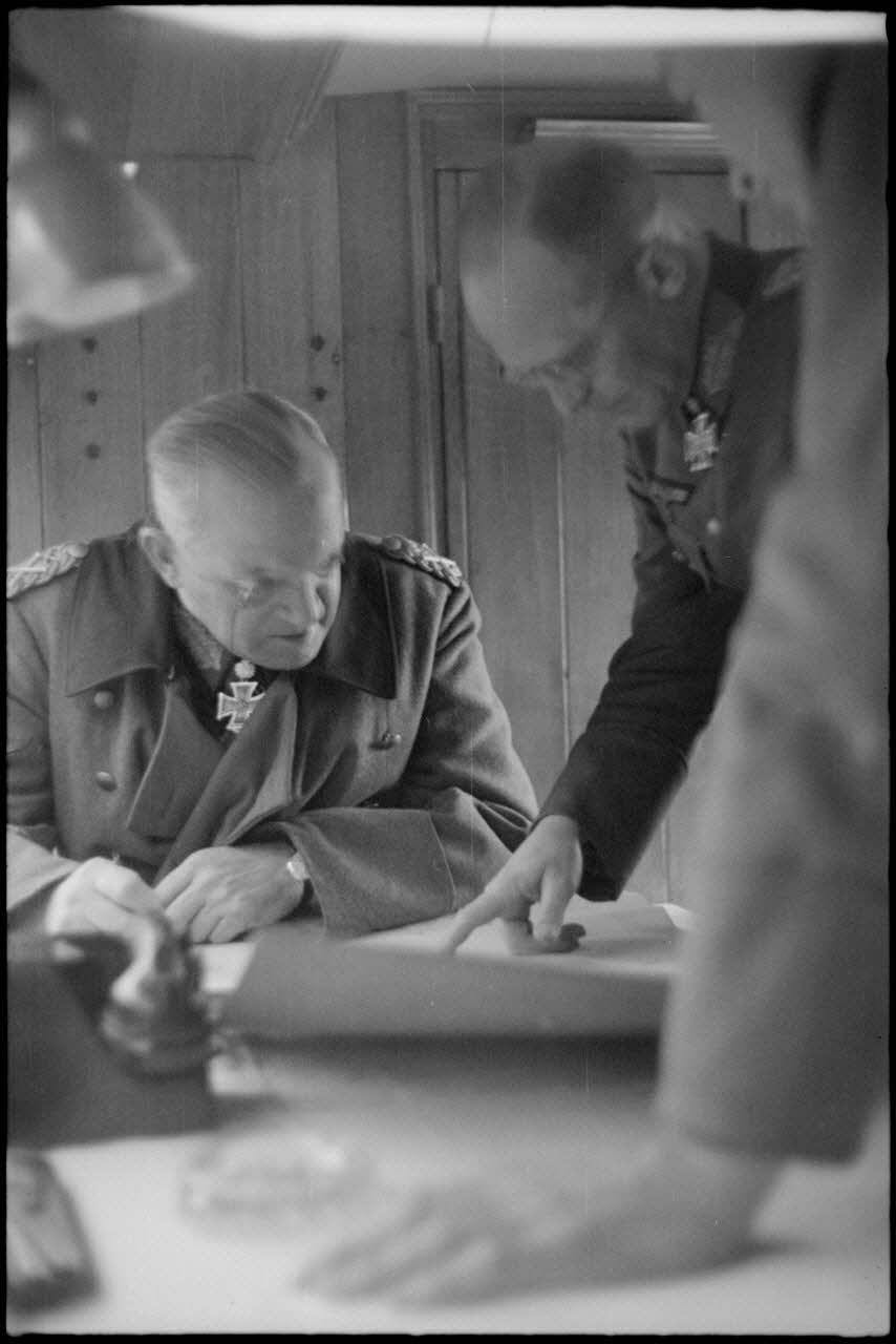 A l'issue d'une réunion d'état-major au PC de la 5. Jäger. Division, le maréchal Ernst Busch s'entretient avec un officier d'état-major.