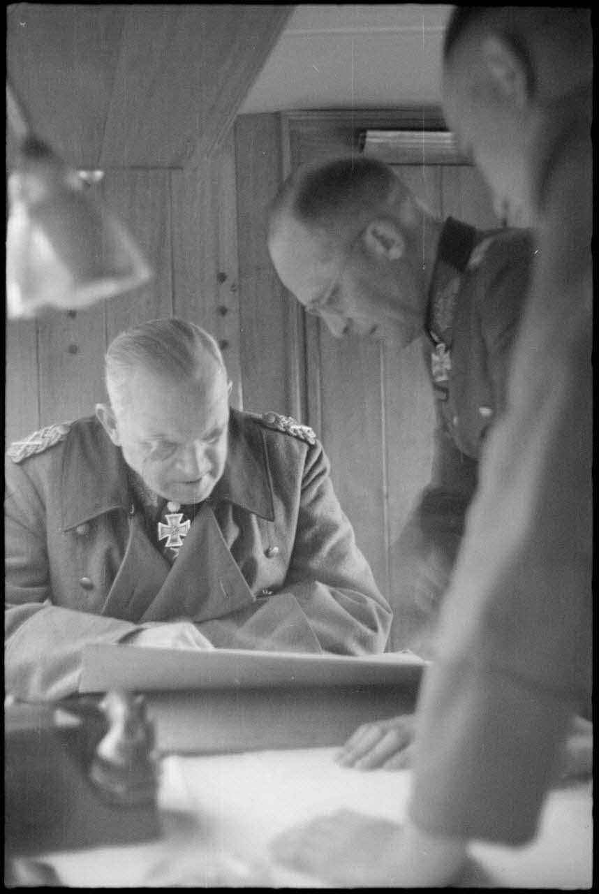 A l'issue d'une réunion d'état-major au PC de la 5. Jäger. Division, le maréchal Ernst Busch s'entretient avec un officier d'état-major.