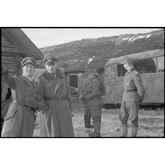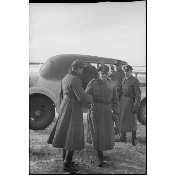Arrivée du maréchal (Generalfeldmarschall) Ernst Busch, nouveau commandant du Groupe d'armées Centre pour une réunion avec le général (Generalleutnant) Helmut Thumm (Kdr. de la 5. Jäger. Division).